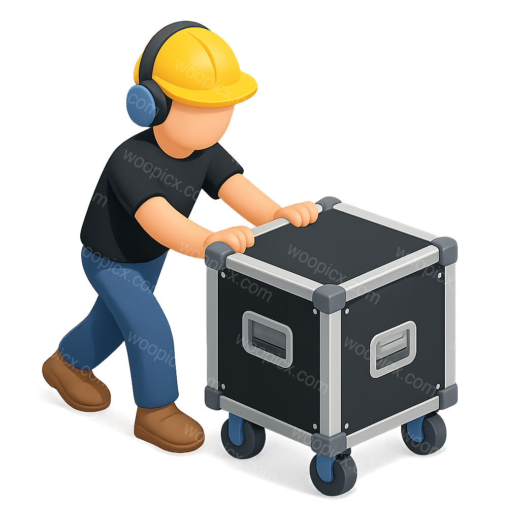/Premium/Collection: /by davooda/Type: PNG/A visually appealing 3D icon depicting a stagehand wearing a hard hat and headphones, pushing a black equipment case on wheels. The design features a three-quarter view and a transparent background.