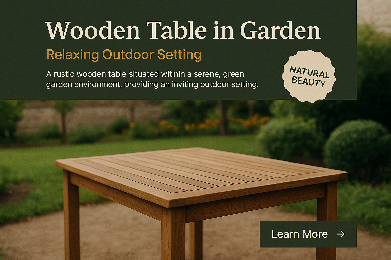 A rustic wooden table sits elegantly in a green garden, surrounded by lush plants. The inviting atmosphere is enhanced by a harmonious color palette and engaging design elements.