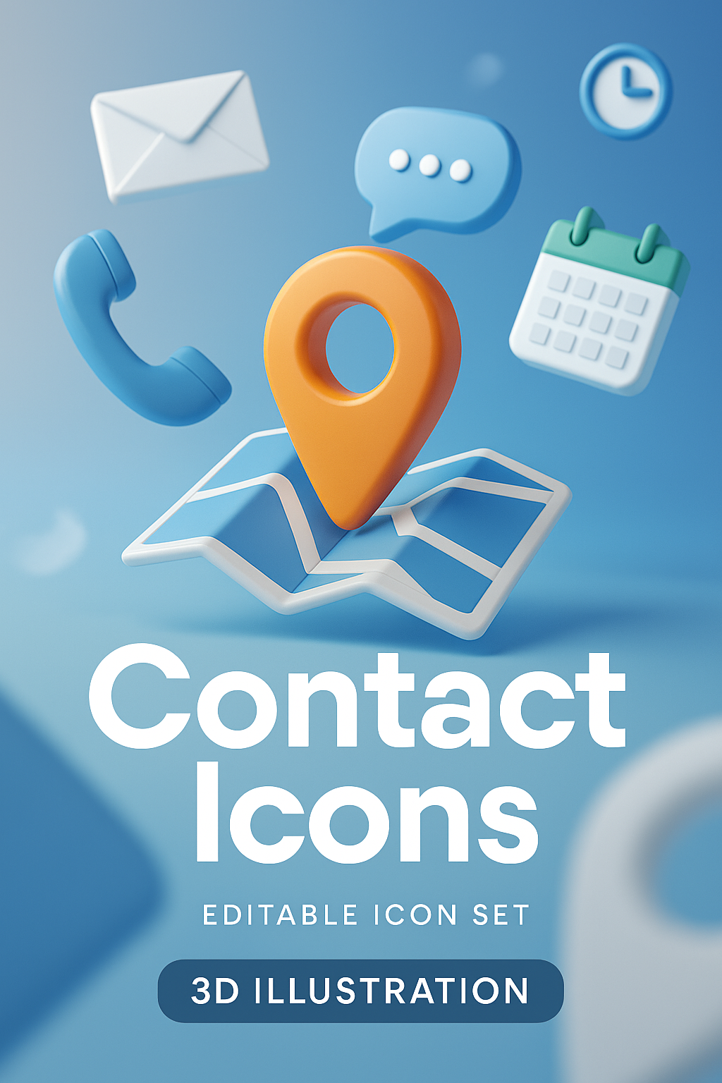 /Collection: /by davooda/Type: PNG/A vibrant 3D illustration showcasing various contact icons like phone, email, and location markers. The design features a smooth gradient background and engaging typography.