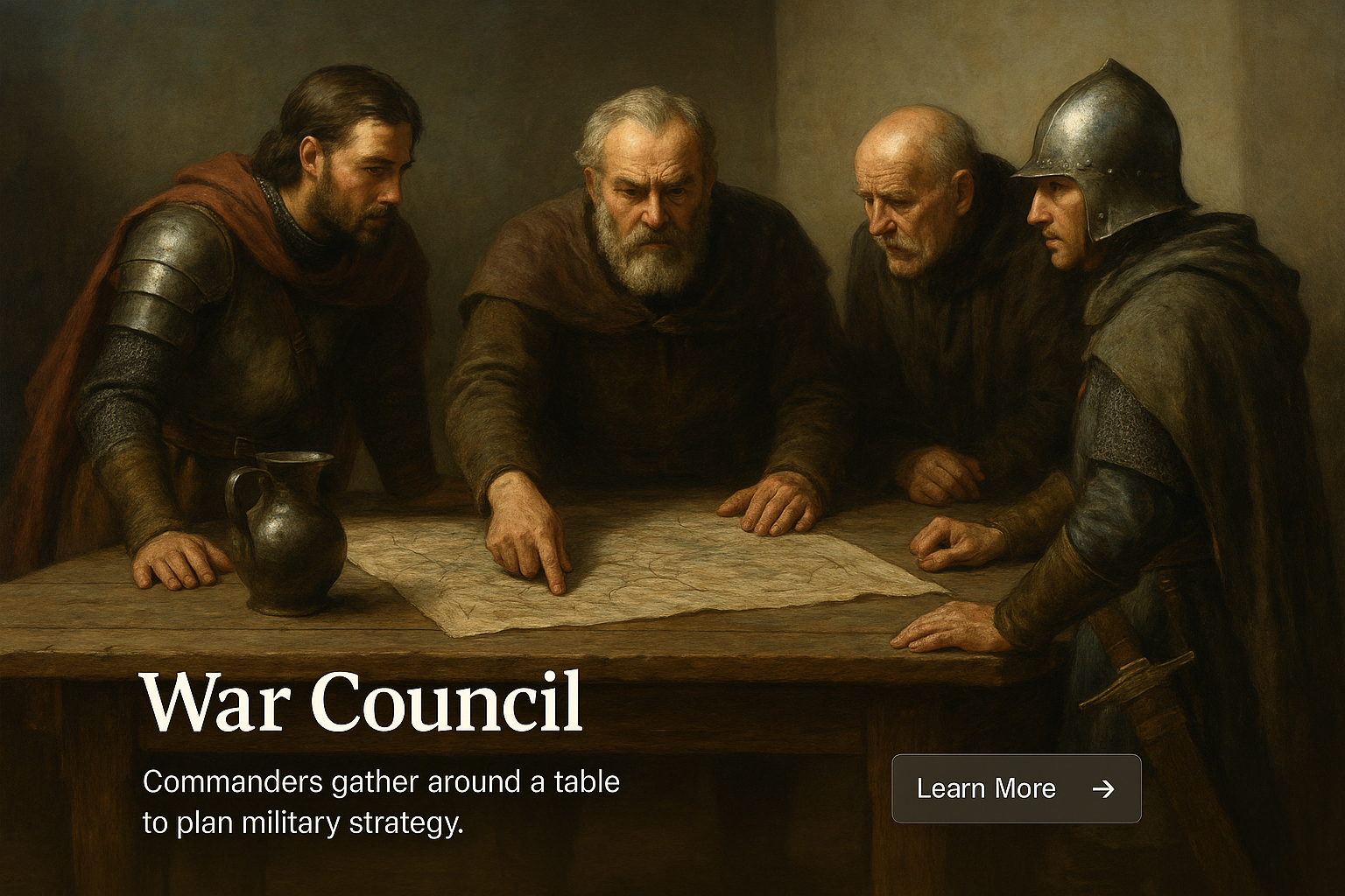 A dramatic depiction of military leaders gathered around a table, analyzing a map to strategize for battle. The scene captures intense focus and collaboration.