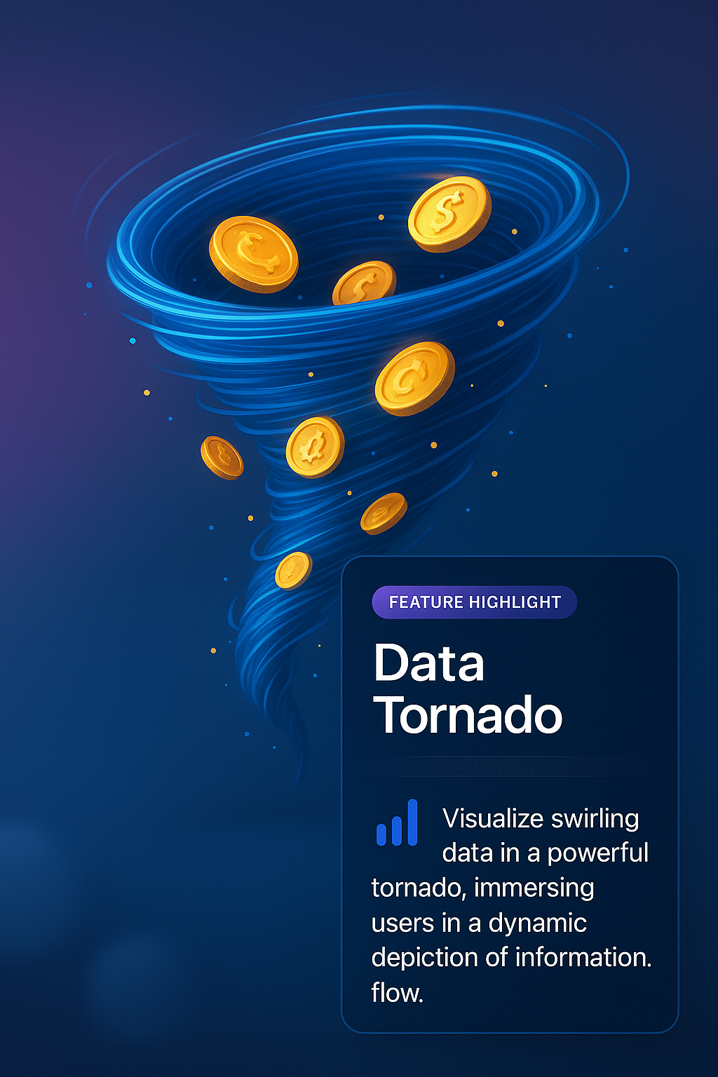 A visually striking 3D illustration of a swirling tornado made of data, with glowing coins spiraling within. The background features a smooth gradient, enhancing the dynamic effect.