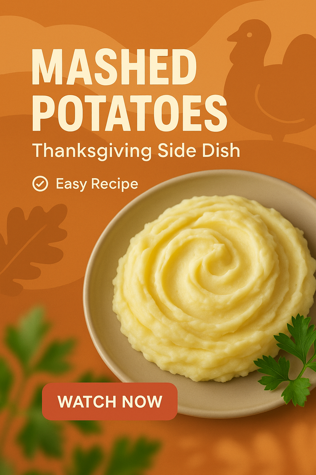 Inviting food graphic showcasing creamy mashed potatoes as a Thanksgiving side dish, designed for easy recipe promotion with a warm color palette.