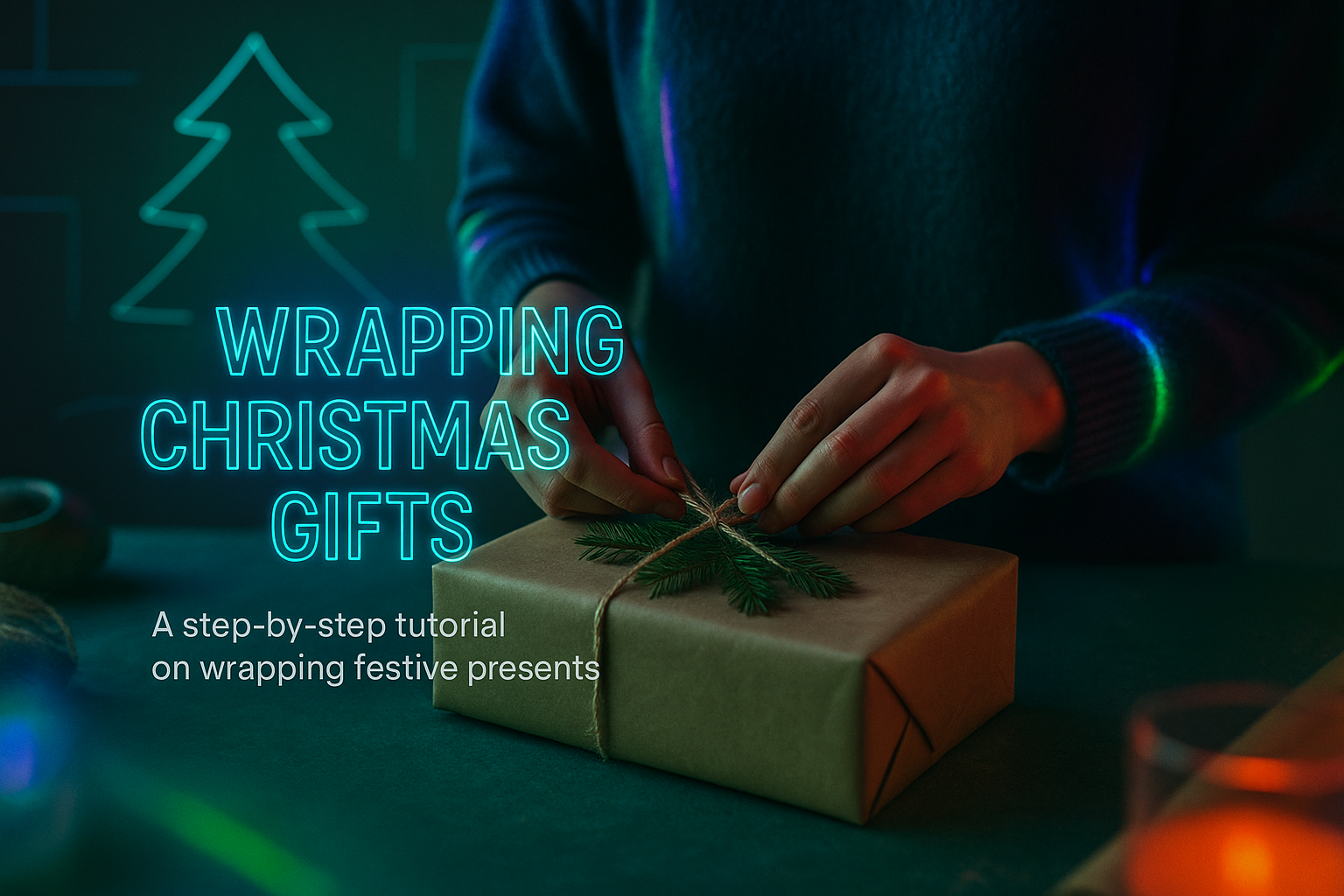 A visually engaging tutorial image showcasing the process of wrapping Christmas gifts, featuring warm lighting and festive elements, ideal for holiday-themed content.
