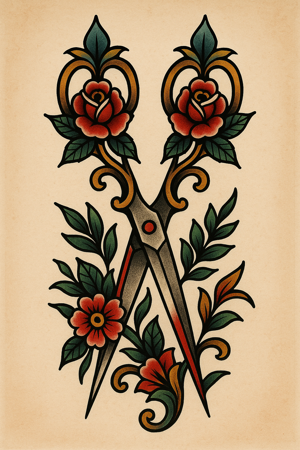 This image features a vintage-style illustration of scissors surrounded by colorful floral elements. It reflects a classic tattoo art style, appealing to art enthusiasts and tattoo lovers.