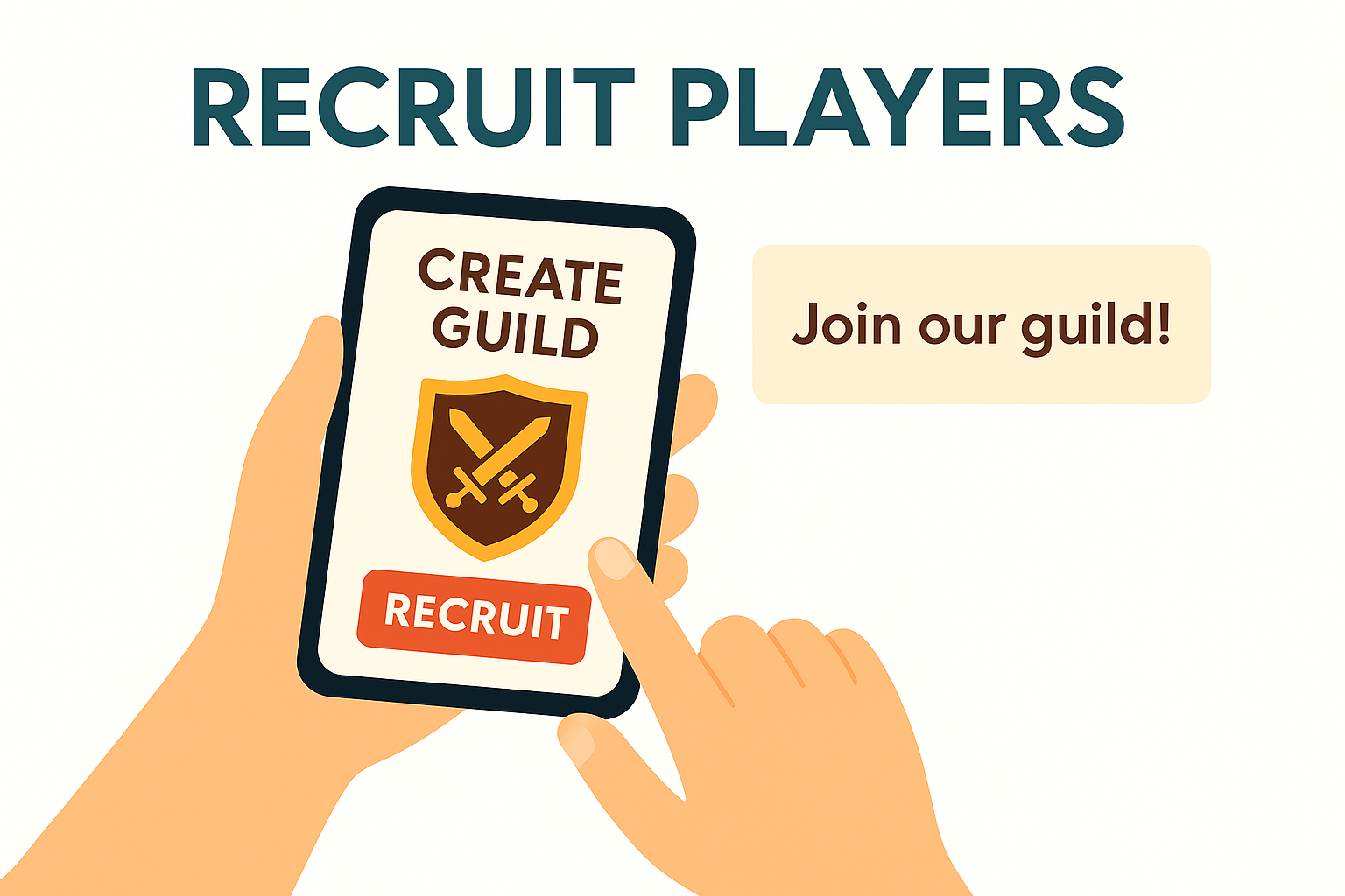 Illustrative graphic designed for mobile gaming recruitment, featuring a hand holding a phone with a guild emblem and call-to-action buttons. Ideal for promoting player engagement.