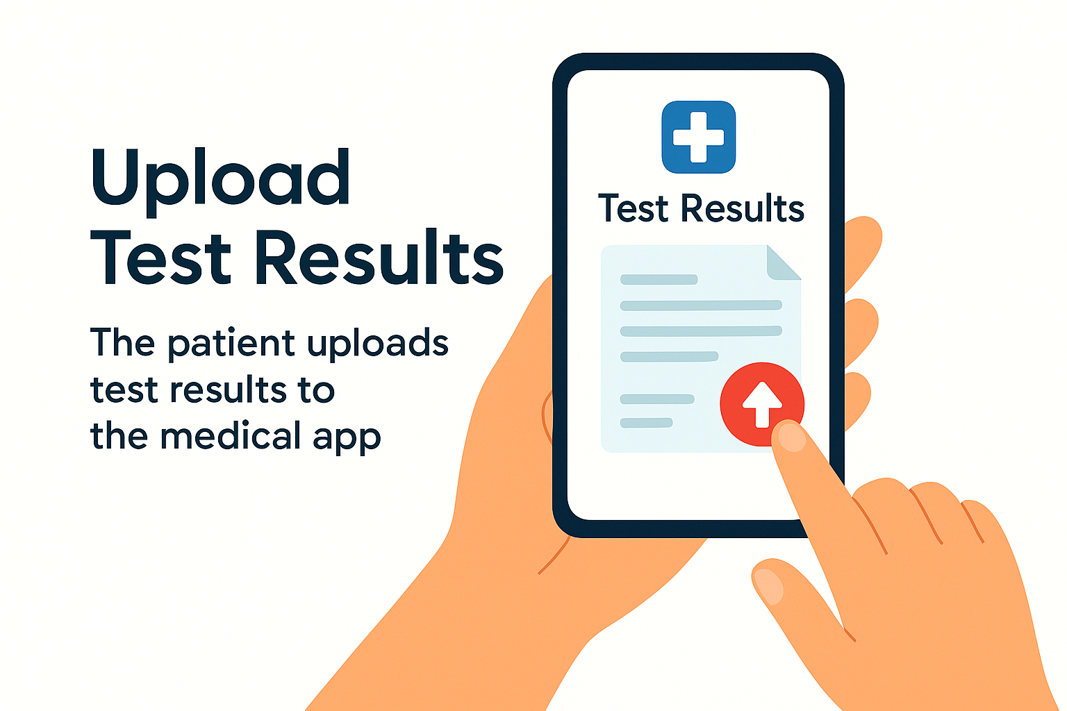 Illustration of a mobile app interface where a patient uploads test results. The design features a clean and modern aesthetic, making it suitable for healthcare-related applications.