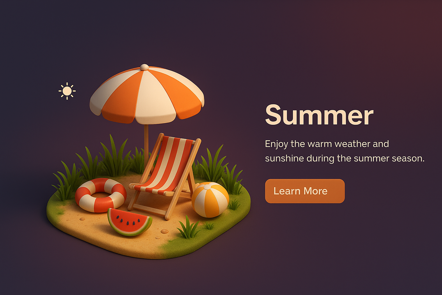 /Collection: /by davooda/Type: PNG/A vibrant summer-themed 3D scene featuring a beach chair, umbrella, and playful elements like a beach ball and watermelon, all set against a smooth gradient background.