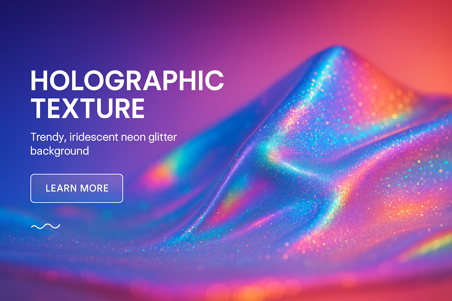This image features a vibrant, holographic texture with an iridescent glow, ideal for backgrounds and digital designs. The visual style is modern and eye-catching, suitable for various creative projects.