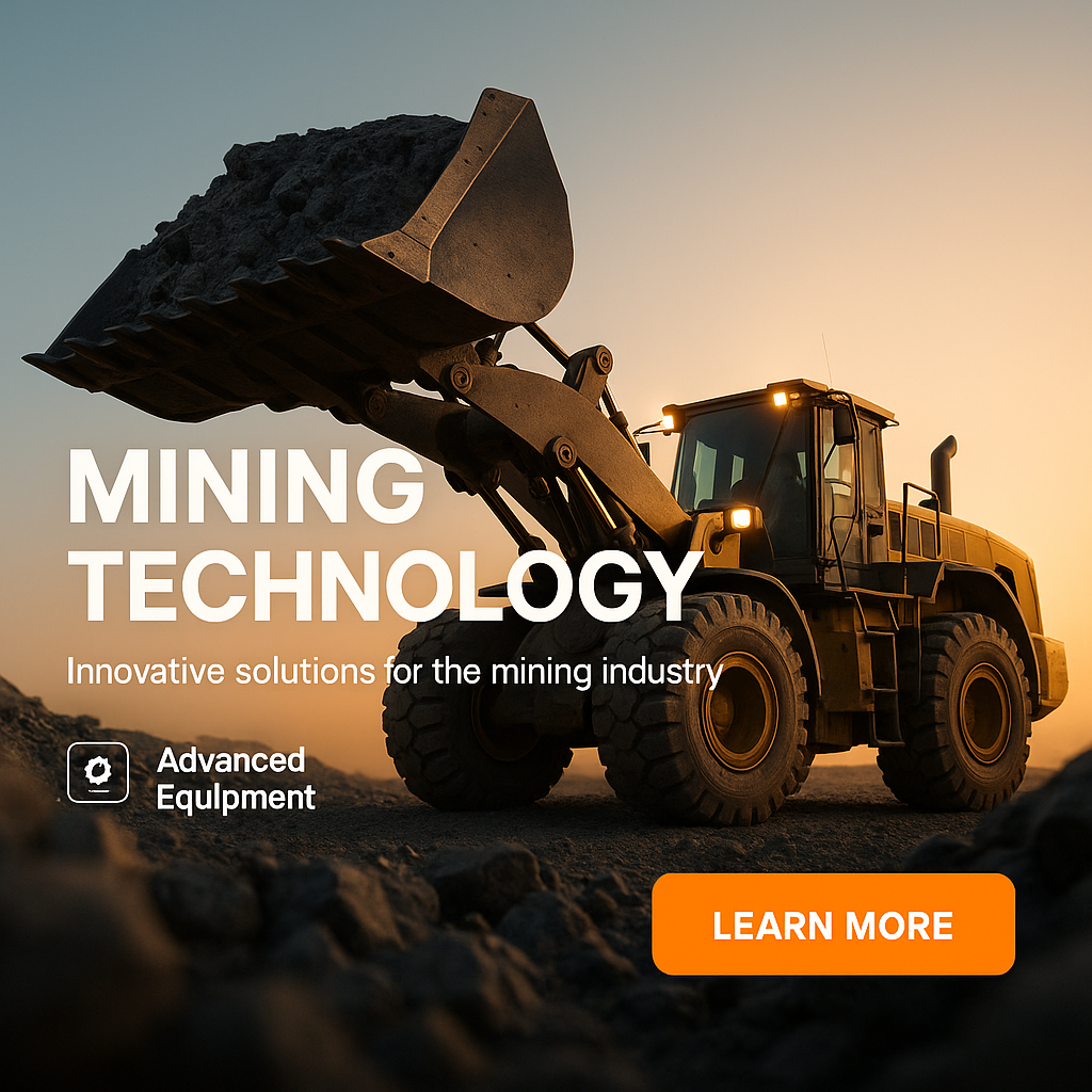 This image is a promotional graphic showcasing mining technology, featuring heavy machinery in a dramatic sunset setting. It targets industry professionals.