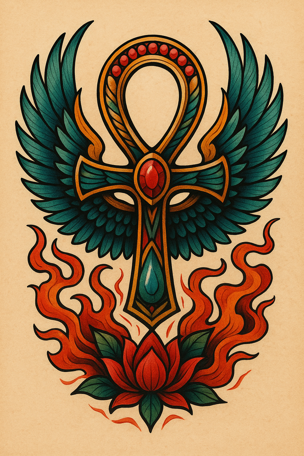 This graphic features a colorful ankh symbol adorned with wings, flames, and a lotus flower. It combines traditional motifs with a modern, illustrative style, suitable for art prints or tattoos.