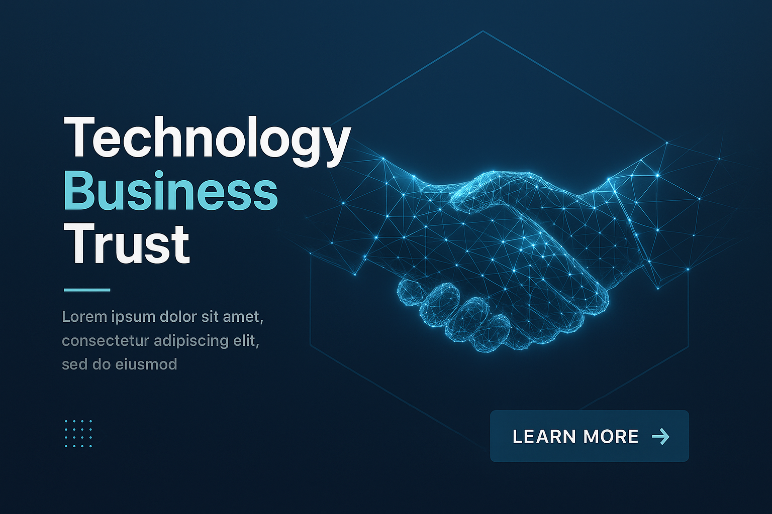 /Collection: /by davooda/Type: PNG/An illustration featuring two glowing wireframe hands in a handshake, symbolizing trust in technology and business. It incorporates a gradient background and a clear text layout.