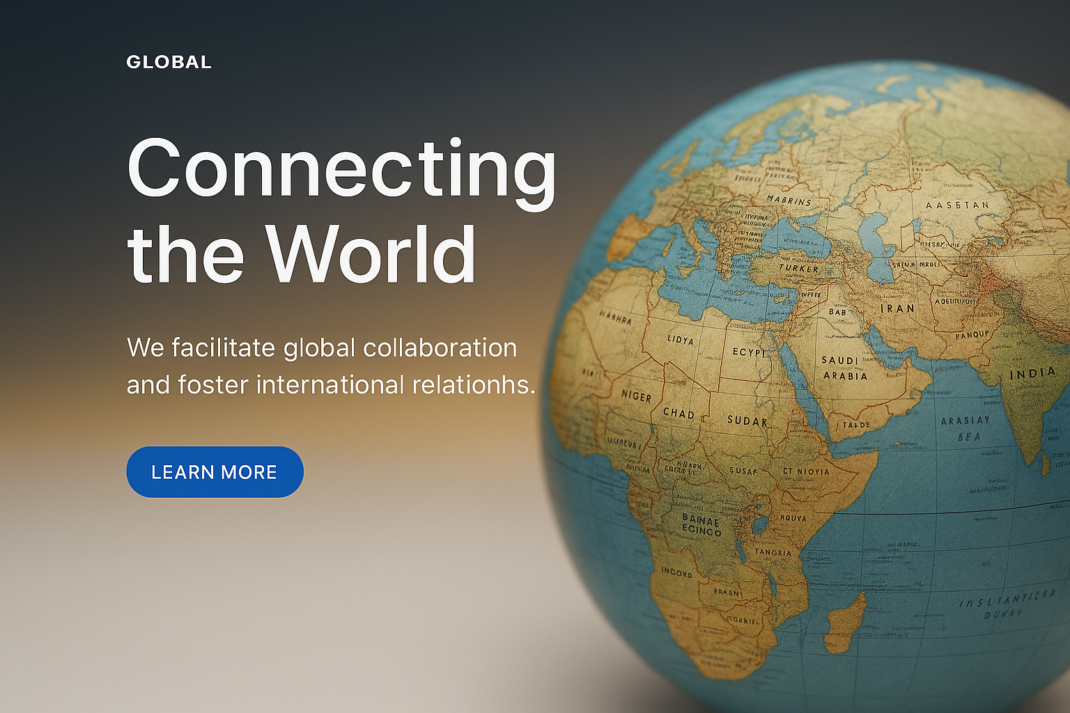 /Collection: /by davooda/Type: PNG/A high-resolution web page concept featuring a globe with text elements. It includes a small label, a brief title, and a text block promoting global collaboration.