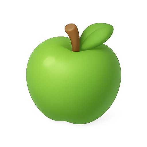 A vibrant 3D illustration of a green apple with a smooth texture and a brown stem, ideal for food-related designs or educational content.