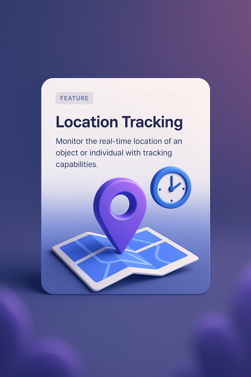 /Collection: /by davooda/Type: PNG/A modern 3D illustration showcasing a location tracking feature. It includes a map with a prominent pin and a clock, set against a smooth gradient background.