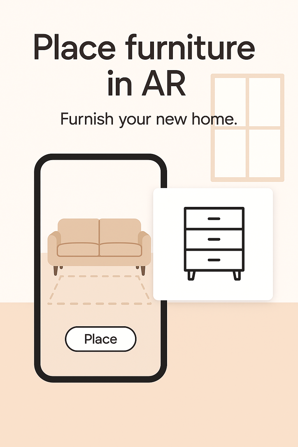 User interface mockup for an augmented reality app allowing users to place virtual furniture in their space, featuring minimalistic design elements for a modern look.