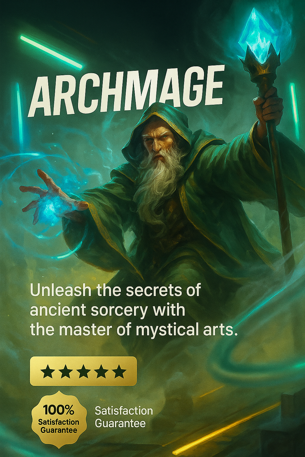 /Collection: /by davooda/Type: PNG/A vibrant design featuring an archmage casting spells, highlighted by neon accents and mystical green and blue hues, with engaging text elements and a satisfaction guarantee.