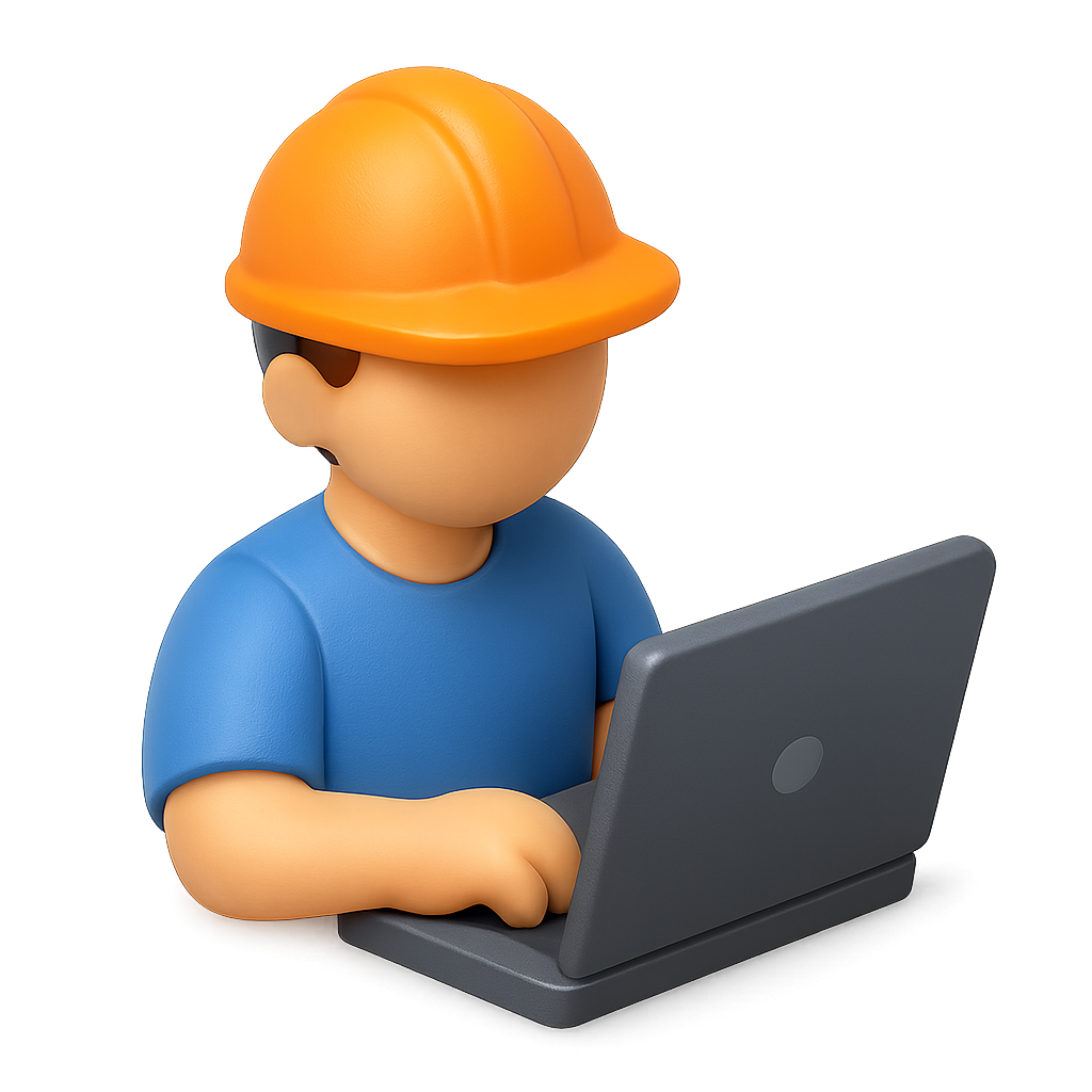 A 3D icon featuring a worker wearing an orange hard hat, seated and working on a laptop. The design is in a three-quarter view with a transparent background, emphasizing a modern and volumetric style.