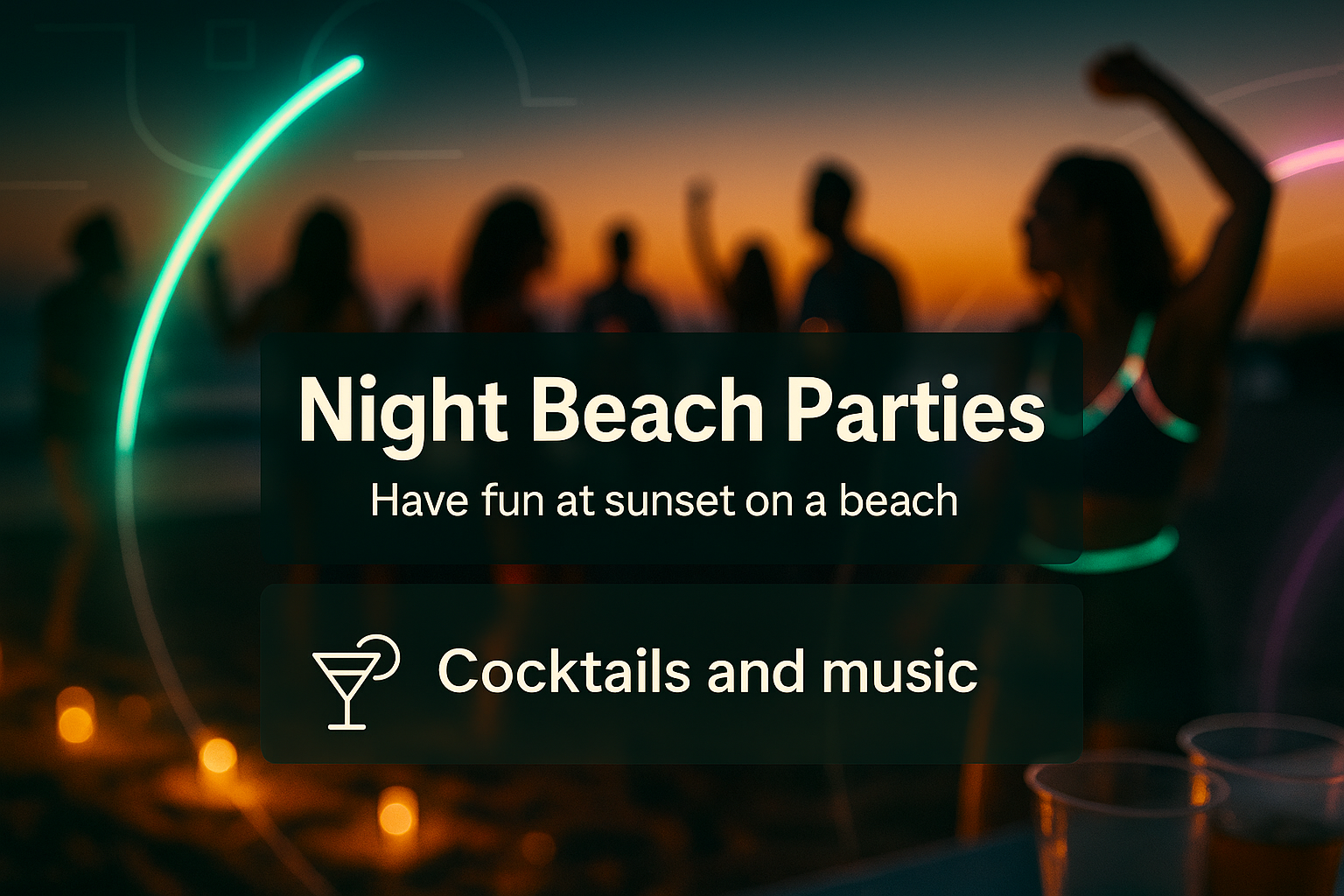 A lively promotional graphic for night beach parties featuring silhouettes of people, glowing lights, and a sunset backdrop, ideal for event marketing.