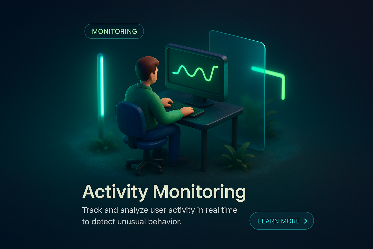 A detailed 3D illustration of a user monitoring activity on a computer, set against a dark gradient background with neon accents and subtle fog effects.