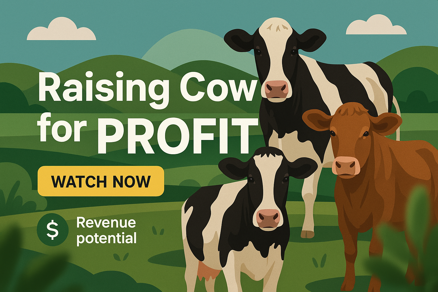 Engaging promotional image featuring cows in a pastoral setting, aimed at educating viewers on the profitability of raising cows. Ideal for online marketing and educational content.