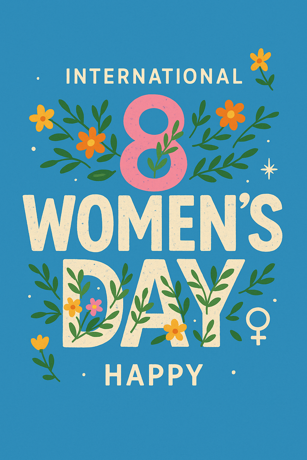 Colorful graphic celebrating International Women's Day, featuring floral elements and bold typography, ideal for social media posts and event promotions.
