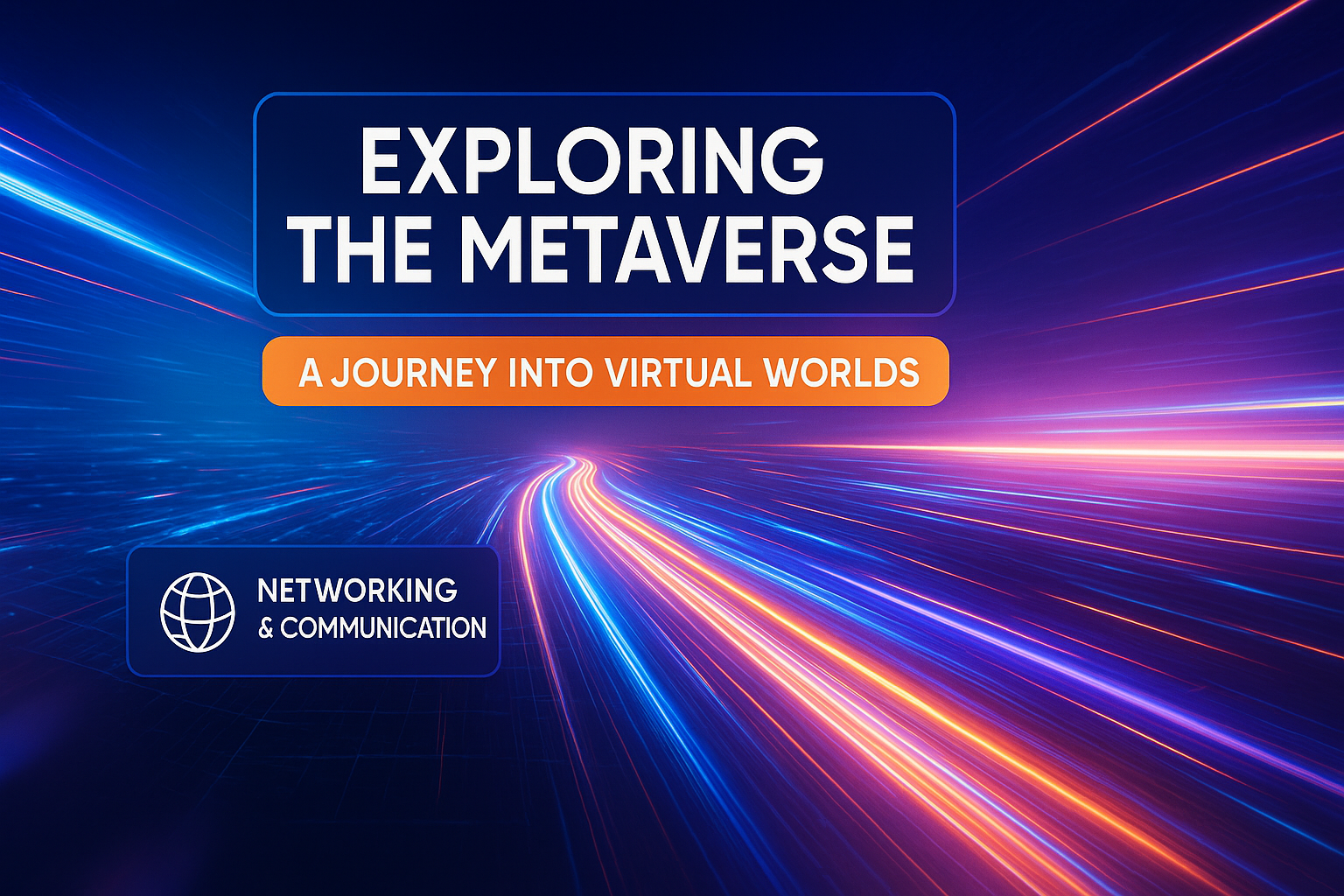 Vibrant digital graphic showcasing a journey into the metaverse, featuring futuristic light trails and a modern design, ideal for tech events or online content.
