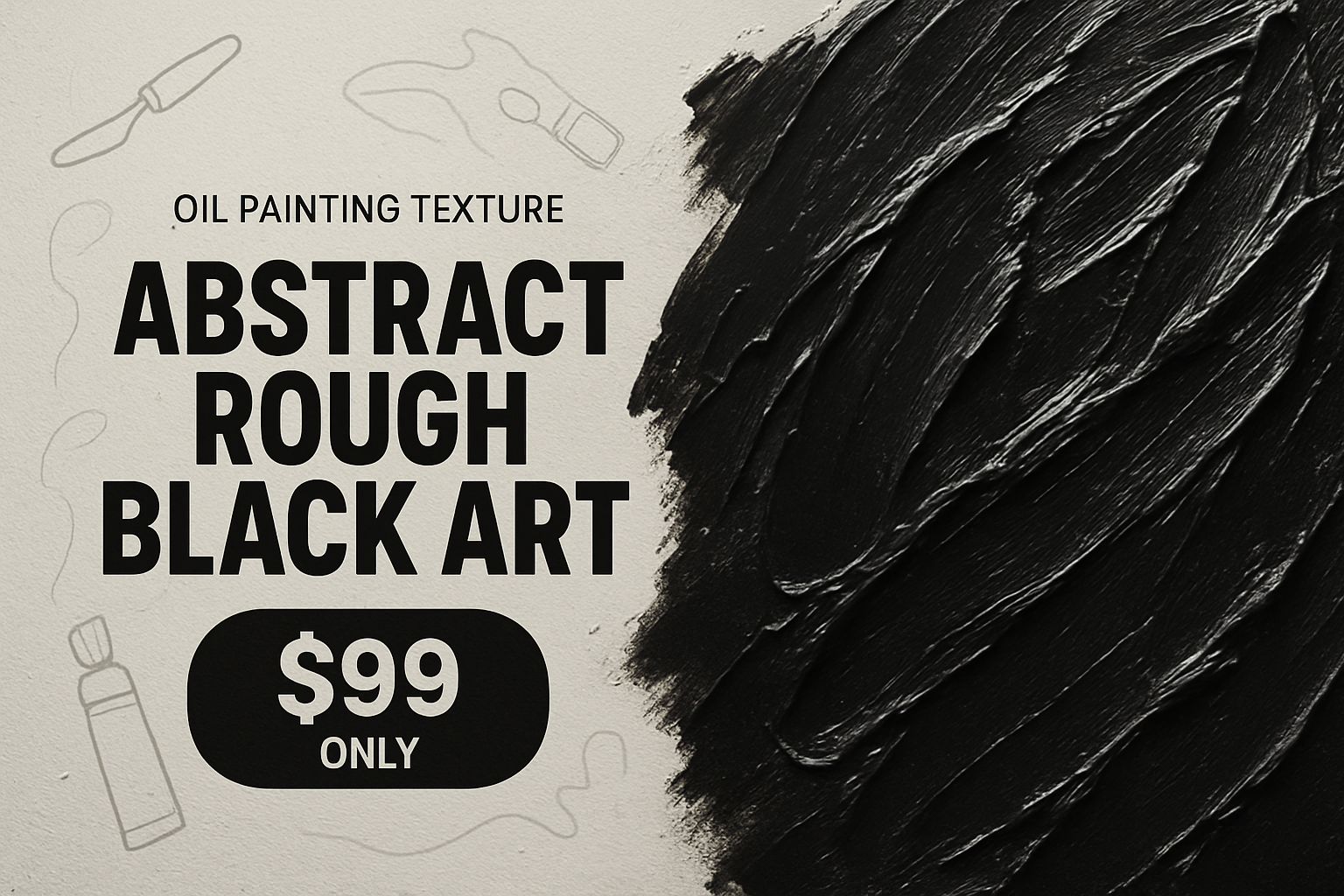 /Collection: /by davooda/Type: PNG/A closeup of an abstract black art painting texture features oil brushstrokes and a modern advertisement layout. Bold typography and a price tag add visual interest.