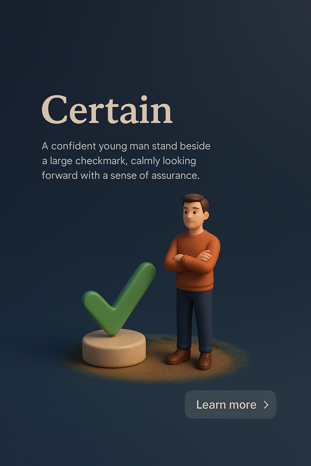 /Collection: /by davooda/Type: PNG/A stylized 3D scene featuring a confident young man next to a large checkmark, set against a dark gradient background. The composition emphasizes assurance and clarity.