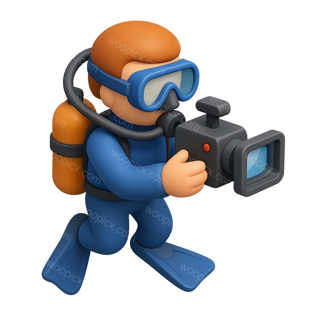 A 3D icon of an underwater cameraman, showcasing a diver in gear holding a camera. The figure is depicted in a three-quarter view with a transparent background, emphasizing a volumetric and isometric style.
