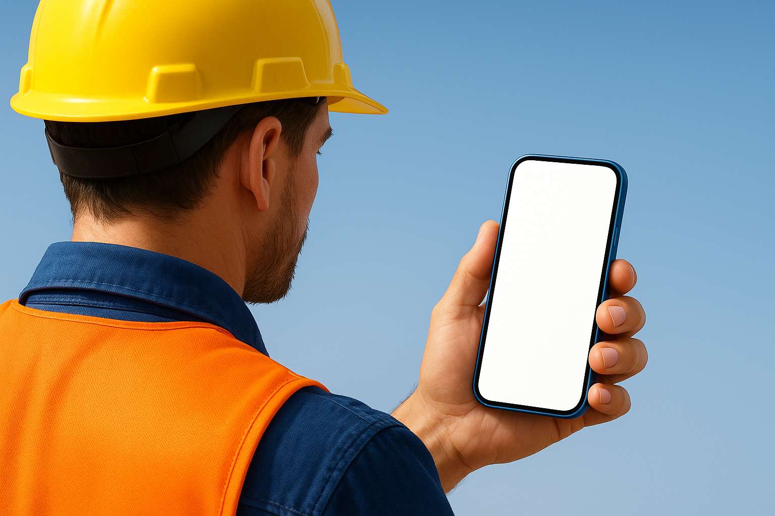 /Collection: /by davooda/Type: PNG/A construction worker in a hard hat and safety vest holds a blue smartphone with a blank screen. The image captures a dynamic angle from behind the worker, showcasing a clear blue sky.