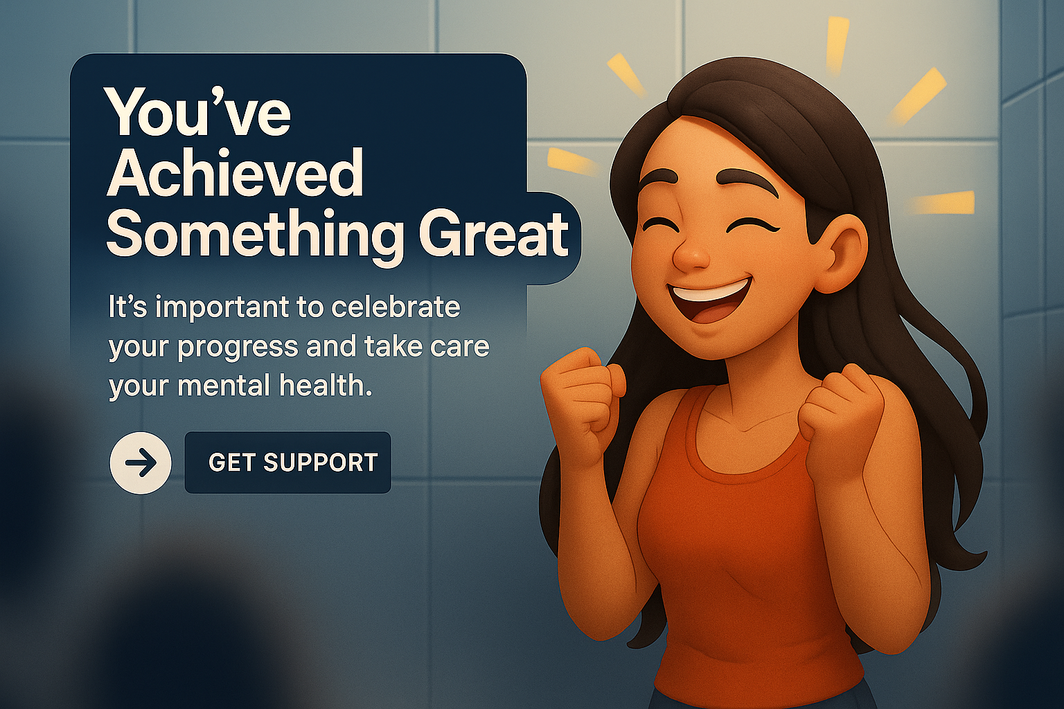 An uplifting graphic designed to promote mental health awareness, featuring an animated character celebrating personal achievements. Ideal for social media or wellness campaigns.