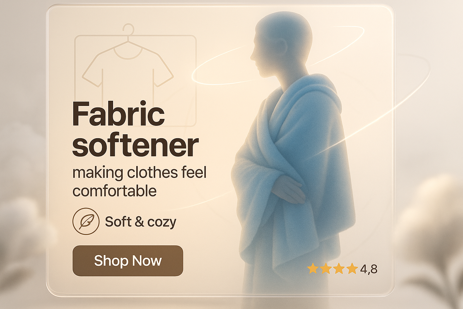 Stylish promotional banner featuring a serene figure representing comfort, designed to advertise fabric softener. Ideal for e-commerce and product marketing.