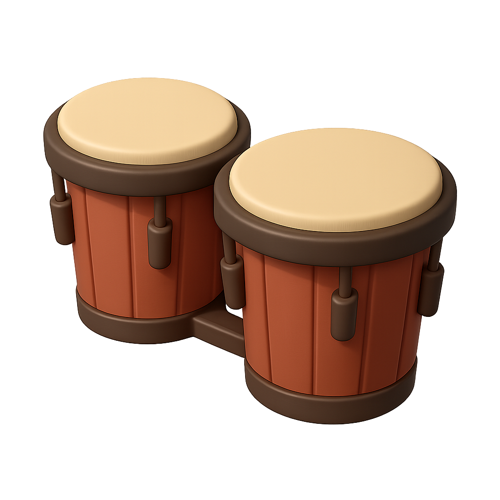 A visually appealing 3D representation of bongo drums, featuring a three-quarter view with a glossy finish. The drums are designed with a blend of warm colors, emphasizing depth and texture.