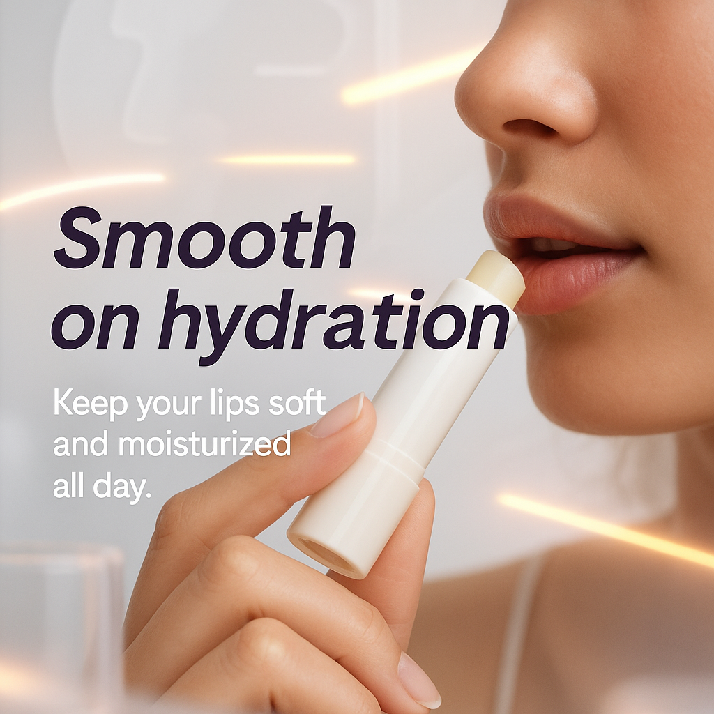 Modern promotional image featuring a close-up of a woman applying lip balm, emphasizing hydration and moisture. Ideal for beauty product marketing.