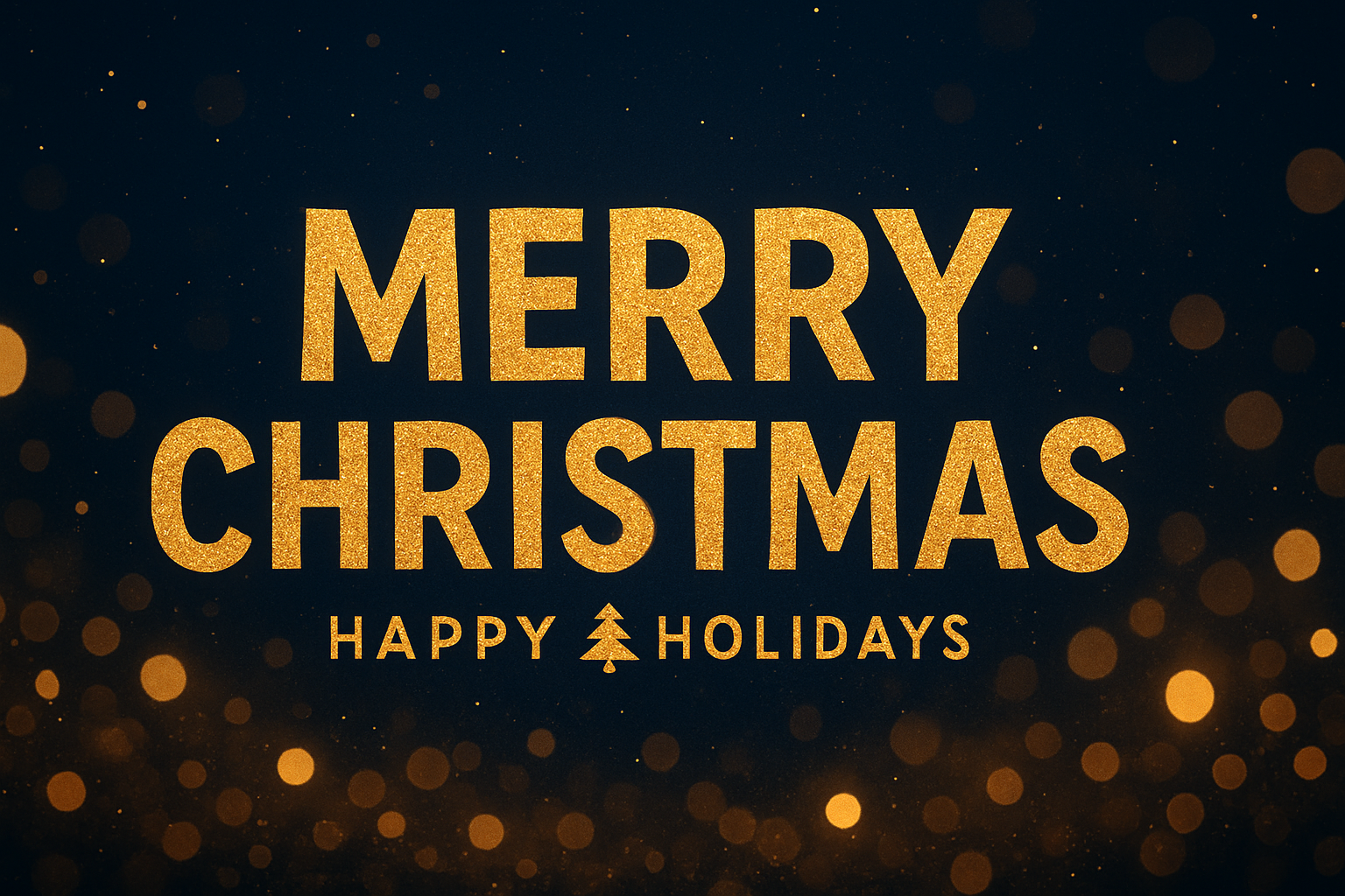 A vibrant holiday greeting card featuring bold golden typography on a dark background, perfect for Christmas and holiday celebrations. Ideal for festive promotions or personal messages.