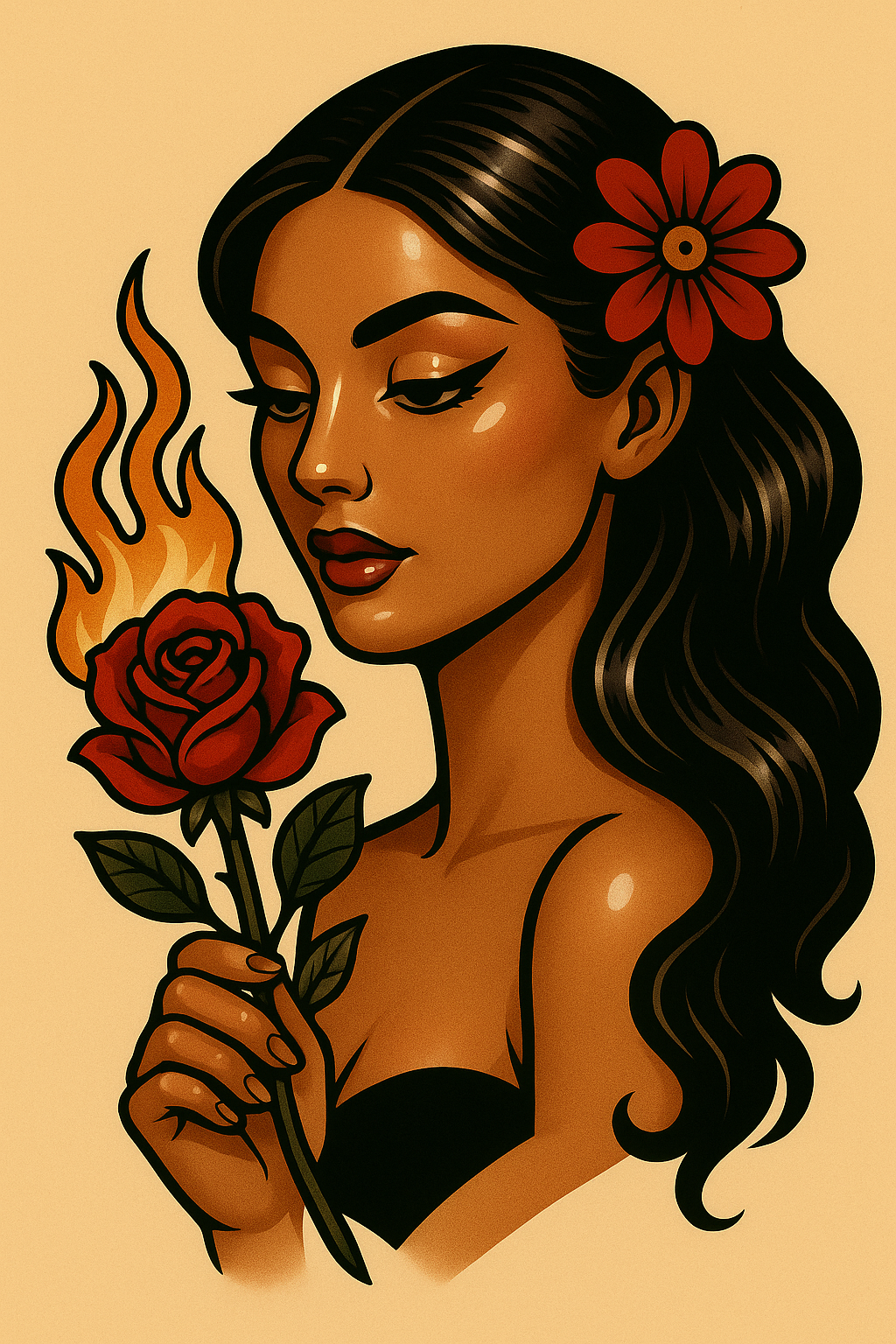 /Collection: /by davooda/Type: PNG/A visually striking illustration of a girl holding a burning rose, styled like a classic tattoo with glossy anime-like highlights. The background is a soft beige, enhancing the rich colors.