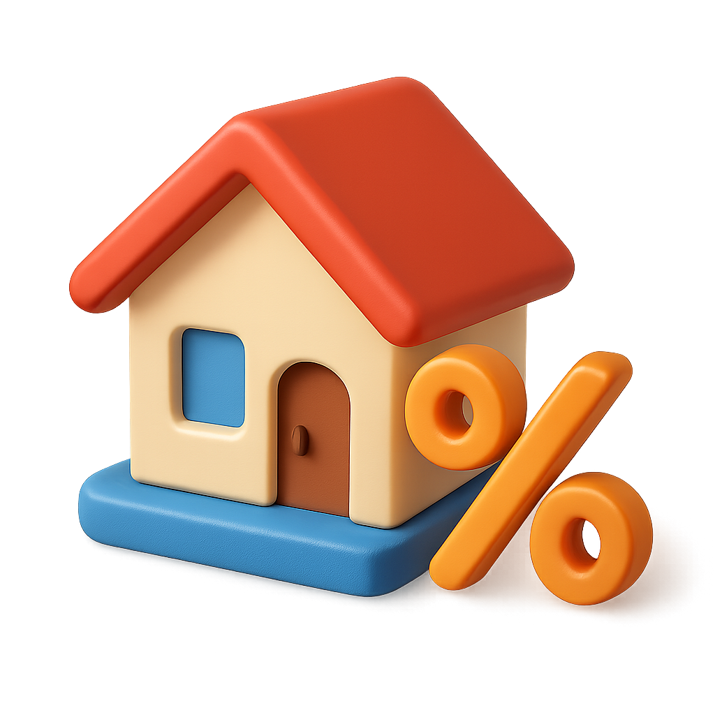 A colorful 3D house icon featuring a percentage sign, designed in a three-quarter isometric view. The house has a vibrant red roof and beige walls, sitting on a blue base.
