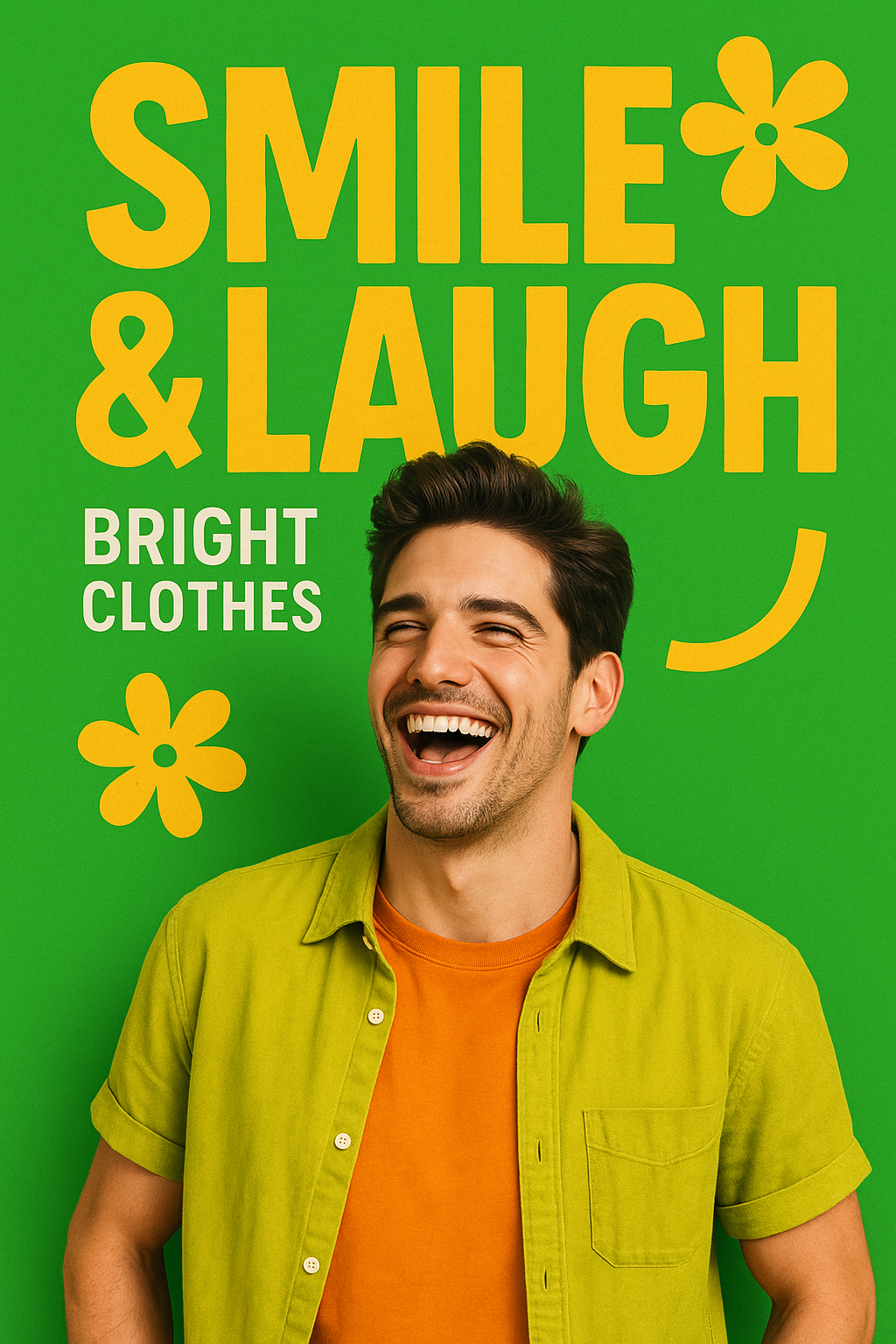 Vibrant Advertisement Featuring a Laughing Man in Bright Clothes