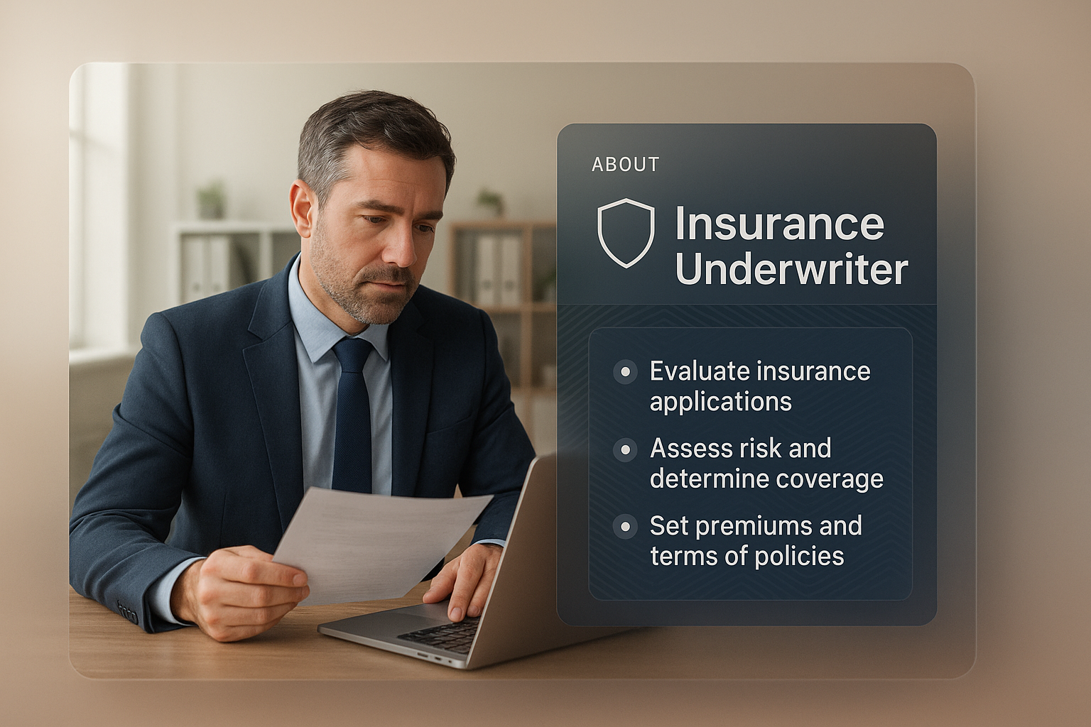 A professional web page layout featuring an insurance underwriter evaluating applications. The design includes clear text, icons, and a cohesive gradient background.