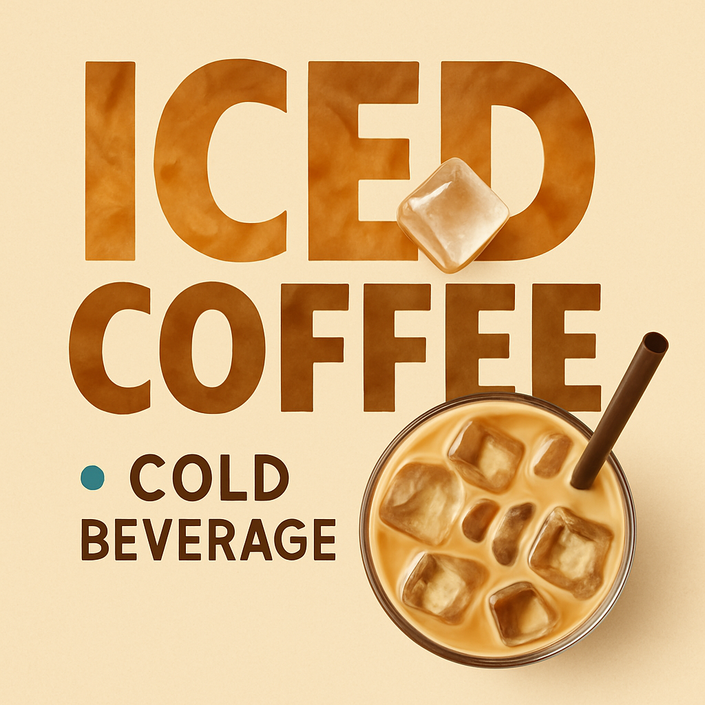 Vibrant promotional image featuring a refreshing iced coffee drink with ice cubes and a bold typography design, ideal for marketing cold beverages.