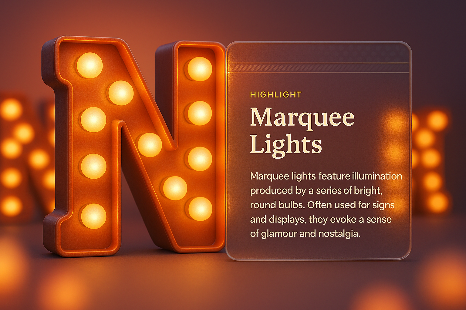 A vibrant 3D representation of marquee lights featuring the letter 'N' illuminated by round bulbs. The design includes a transparent block with text and highlights the nostalgic charm of marquee signage.