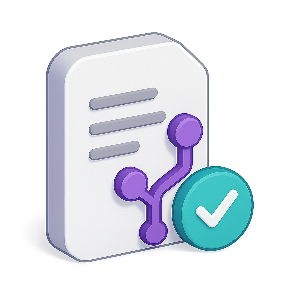 A visually striking 3D icon representing version control, featuring a document with lines and a checkmark symbol. The design emphasizes a modern aesthetic with vibrant colors.