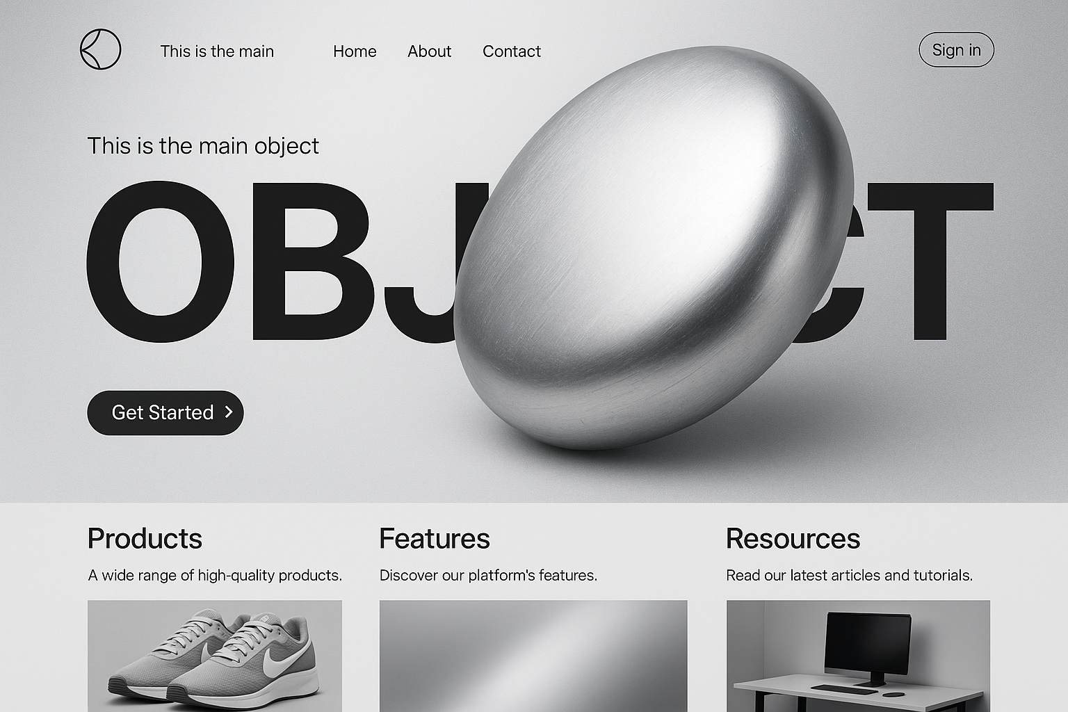 /Collection: /by davooda/Type: PNG/A sleek, modern landing page design featuring a hyper-realistic metallic object against a silver gradient background. The layout includes bold typography and minimalistic elements.