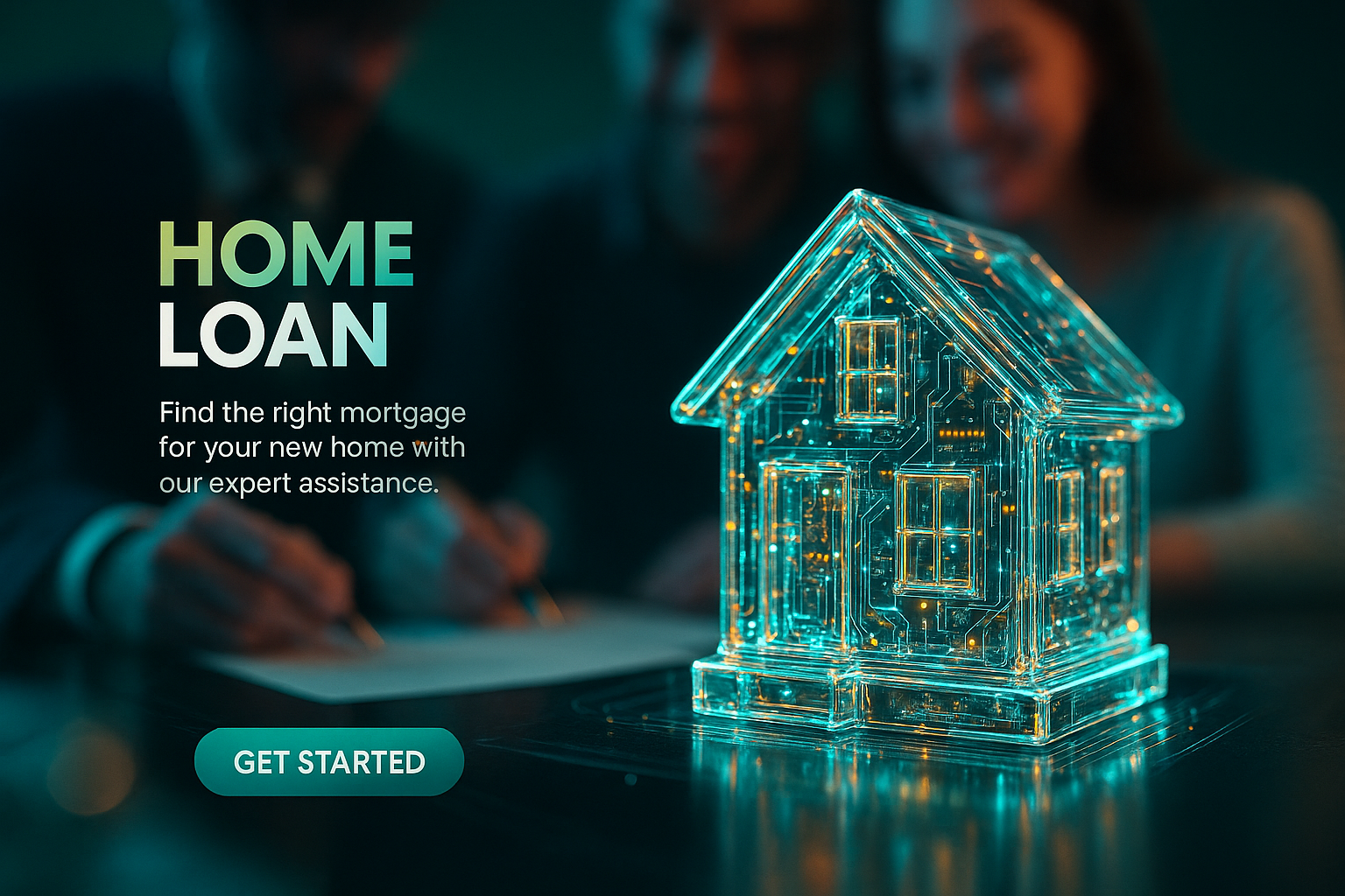 /Collection: /by davooda/Type: PNG/A futuristic miniature house glows with intricate details, symbolizing a home loan. Happy clients discuss their mortgage agreement with an agent, set in a soft-lit environment.