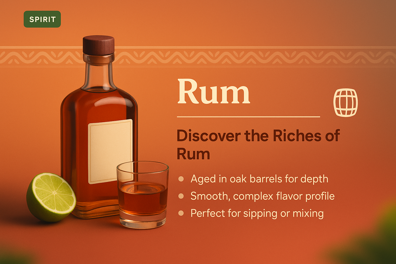 /Collection: /by davooda/Type: PNG/A visually appealing landing page showcasing rum with a 3D bottle and glass. Features vibrant colors, descriptive text, and engaging bullet points highlighting rum's qualities.