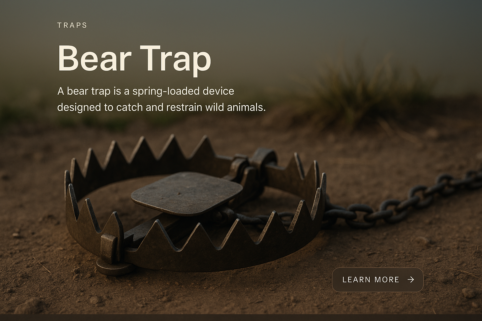 /Collection: /by davooda/Type: PNG/A detailed illustration of a bear trap set against a natural environment. The design features a gradient background, clear typography, and a focus on realism.