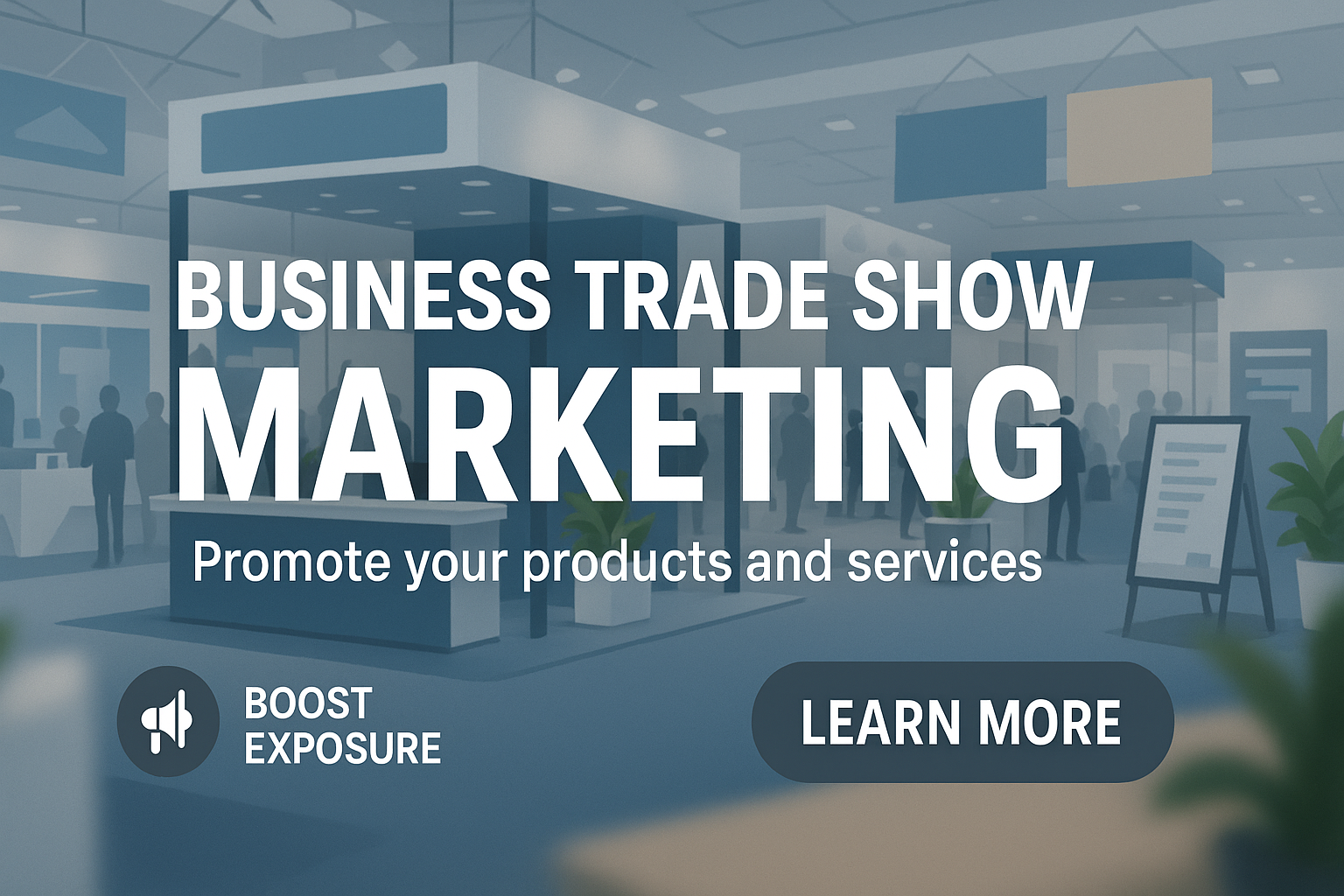 /Collection: /by davooda/Type: PNG/Illustrative graphic designed for promoting business trade show marketing, featuring a visual representation of a trade show environment with clear calls to action.