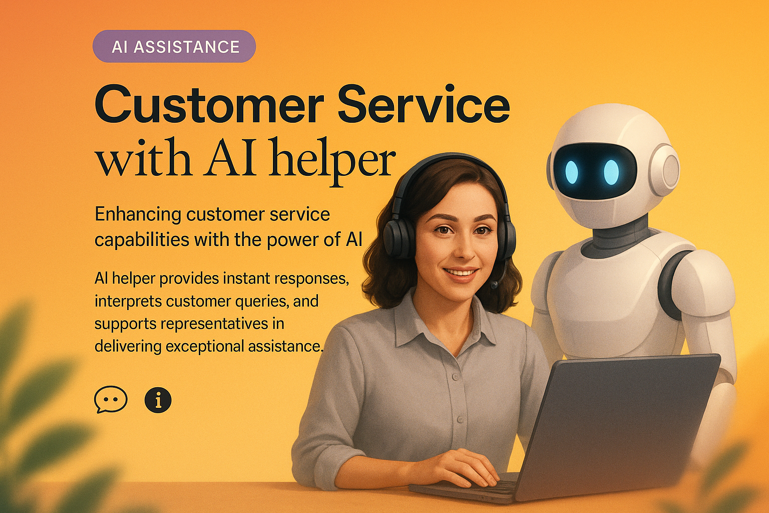 /Collection: /by davooda/Type: PNG/A vibrant landing page design featuring a customer service representative with an AI helper. The composition includes contrasting text elements and a two-color gradient background.