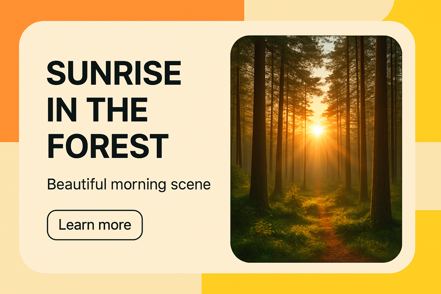 /Collection: /by davooda/Type: PNG/A clean corporate style image showcasing a vibrant sunrise in a forest. The composition features geometric blocks, modern typography, and a call-to-action button, emphasizing clarity.