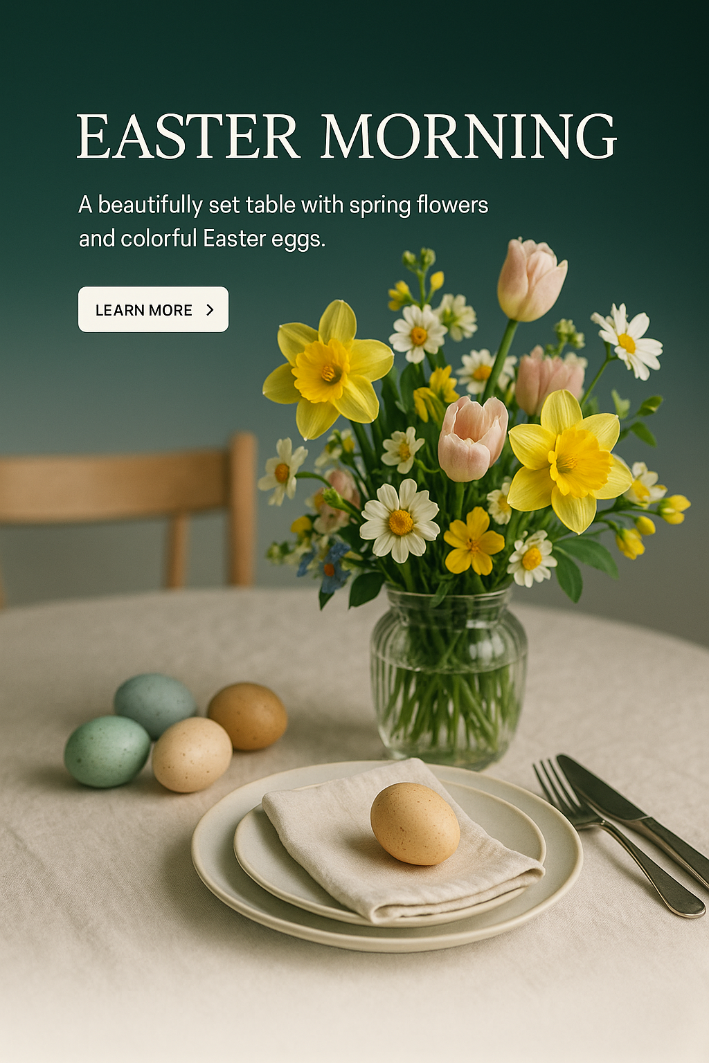 Elegant Easter Table Setting with Spring Flowers and Eggs